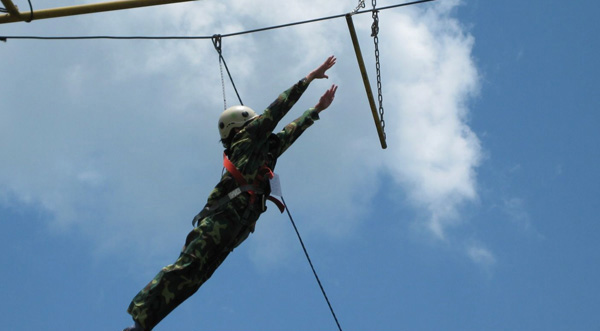 這個項目的名稱是空中抓杠,在進(jìn)行這個項目時,要求參訓(xùn)者,在綁好保險繩、戴好安全帽的前提下逐個爬上起跳臺,從起跳臺向前跳起,抓住前方的單杠,參訓(xùn)者完成以上動作后,由地面保護(hù)人員用保險繩送到地面 。